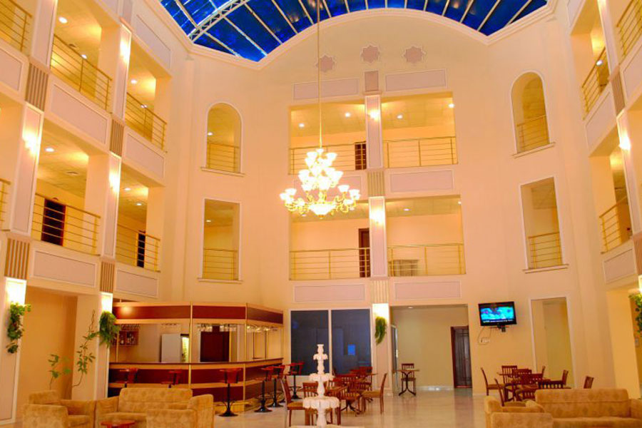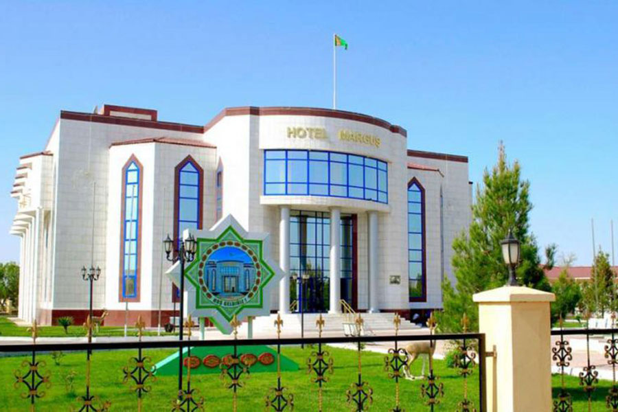 White marble building of modern hotel located in one of the most beautiful places of the administrative center of the oblast, on the banks of the river Murghab valley, in the former riverbed which millennia ago was born the legendary country of Margush.